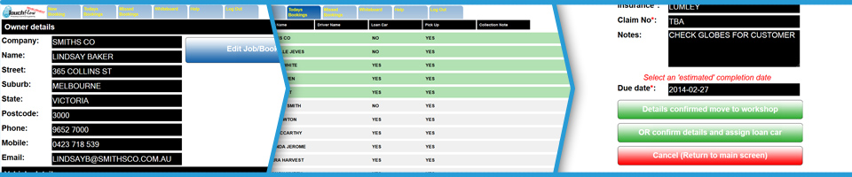 Touchflow provides a comprehensive Booking Diary. You can see the total of what is booked to come in and when they are coming in. You can easily see which of those jobs are coming in 'Today' with clear colour coding. Bookings can be made with only a few details or the complete details depending on what is available. We have included an auto-populate feature for repeat companies to avoid having to re-enter their information. Booking notes are included for additional details including the requirement of a loan car, pickup and other general notes. The 'Missed Bookings' list shows a display of past dated bookings that didn't turn up so you can easily follow up with these customers. Bookings are then turned into workshop jobs when they arrive at your workshop.