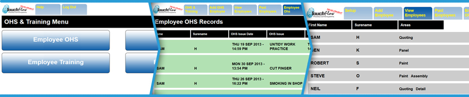 The automotive Smash Repair Industry has a history of overlooking the record keeping component of OHS. Business may do their best to operate in a safe and healthy way but keep very few records of what is done. Touchflow changes this. You can easily keep track of equipment maintenance and training through to injuries and incidents. You can record an OHS report details and also your solution to the report. At a glance you can see what has been resolved and what is still waiting for a solution. It's all easily input with Touchflow and in keeping to the all inclusive nature of Touchflow it's not left as a burden for one person. All of you staff are able to record any type of OHS information within Touchflow and the best thing is it only takes a few moments.